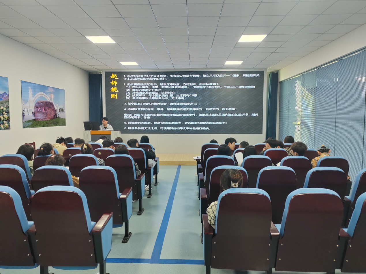 在讲师的引导下,学生们分组扮演英、美、法、日、德、中等6个国家的外交官,根据剧本的故事主线和任务线索,进行推理分析、抽丝剥茧,全情投入外交官身份。在“沉浸式”体验中,大家代表着各自国家,努力通过各种手段争取利益,现场发言讨论、争辩激烈。