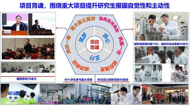 以重大项目为引导,构建“筑梦-润心-正行”育魂体系,打造强军兴国“砺剑育魂工程”,提高研究生服务国家战略的自觉性和紧迫感。