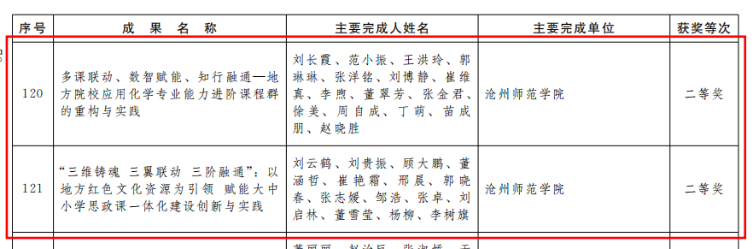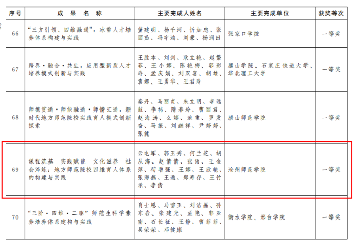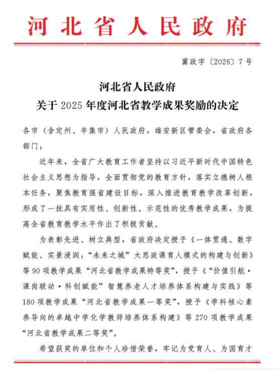 近日,河北省人民政府发布了《河北省人民政府关于2025年度河北省教学成果奖励的决定》,我校申报的党委书记云电军主持的教学成果《课程筑基—实践赋能—文化滋养—社会淬炼:地方师范院校四维育人体系的构建与实践》等三项教学成果全部获得殊荣,取得一等奖1项,二等奖2项。