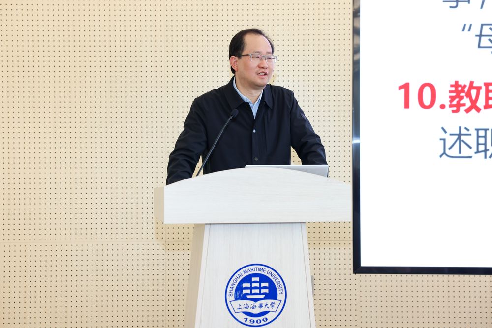 交流发言环节,教务处处长黄顺泉、马克思主义学院院长张峰、校团委书记赵大为、学生处处长顾卫忠、党委教师工作部部长姚裕丰、商船学院党委书记秦立卿分别结合部门、学院职责与工作实际开展交流。