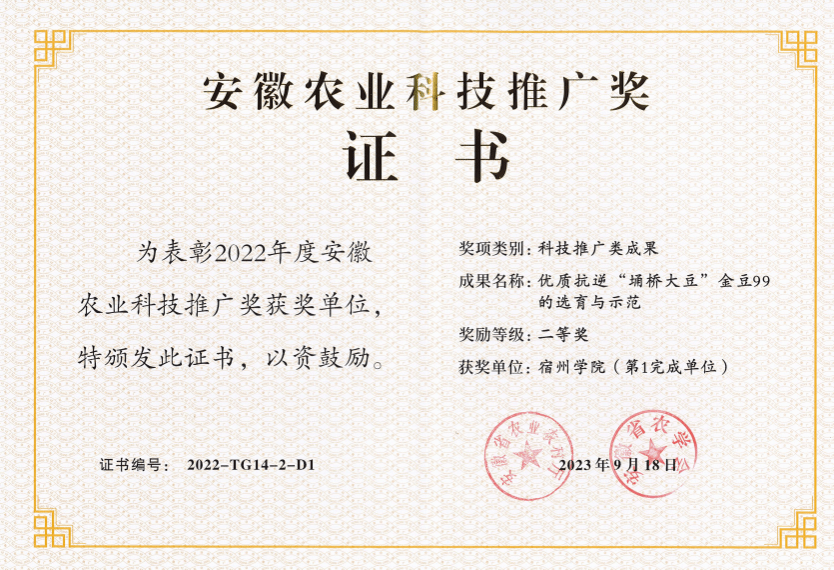 该团队针对安徽省大豆主产区面临的产量低、病虫害频发及成本高等问题,创建了集“抗病品种+栽培优化+生物防治+精准施药”于一体的绿色防控体系。此技术以良种选用、播种精细、密植合理、施肥科学等关键环节为核心,特别适用于皖北及黄淮海麦、豆一年两熟区,已在多地示范推广。该技术不仅解决了抗逆品种短缺、品质不佳等难题,还显著提升了大豆的水溶蛋白含量和售价,同时降低了化肥和农药用量,实现了增产增收和环保双重效益。王传之团队因此荣获2022年“安徽省农业技术推广奖”二等奖和2023年产学研合作创新成果优秀奖。