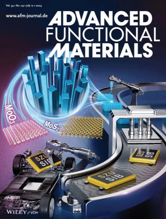 2024年10月,我校自旋电子与纳米材料安徽省高校重点实验室、光电信息材料与新能源器件安徽省科研创新团队在美国Wiley旗下的工程技术领域国际顶尖期刊ADVANCED FUNCTIONAL MATERIALS(影响因子18.5)发表题为“In−situ phase transformation to form MoO3−MoS2 heterostructure with enhanced printable sodium ion storage”的文章(Adv. Funct. Mater. 2024, 2311471),该成果被遴选为当期内封面文章(Inside Front Cover),ESI高被引论文收录。宿州学院为该论文第一完成单位,余良浩博士为第一作者,硕士研究生陶鑫为共同第一作者,朱光教授为通讯作者。温州大学和江苏大学为合作单位。