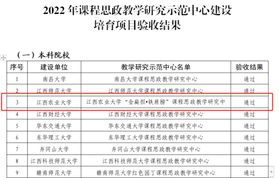 近日,江西省教育厅印发了《关于公布2022年江西省课程思政教学研究示范中心建设培育项目验收结果的通知》(赣教高〔2025〕11号),我校“金扁担·铁肩膀”课程思政教学研究中心顺利通过验收。本次江西省课程思政教学研究示范中心建设培育项目验收,全省仅有9所本科院校获得通过。