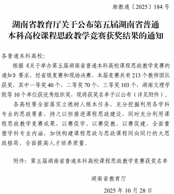近日,湖南省教育厅正式公布第五届湖南省普通本科高校课程思政教学竞赛获奖名单,我院陈莉、徐芬两位教师以长期沉淀的教学成果为基础,凭借深厚且扎实的课程思政育人实践经验,双双荣获省级三等奖,为学院课程思政建设工作再添光彩。