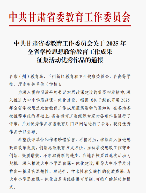 近日,省委教育工委公布了2025年全省学校思想政治教育工作成果征集活动优秀作品名单,我校报送的6项成果获评优秀,展现了学校在思政教育领域扎实的工作基础与持续的创新活力。