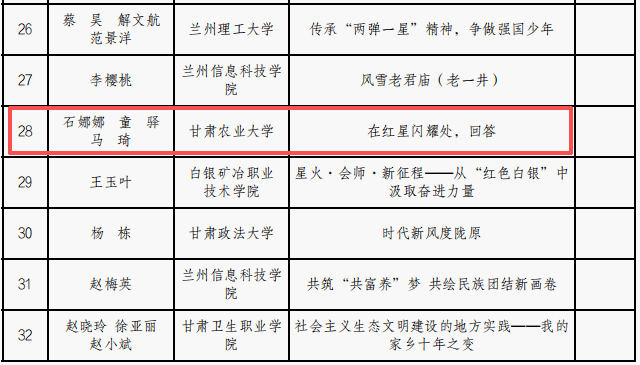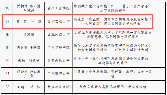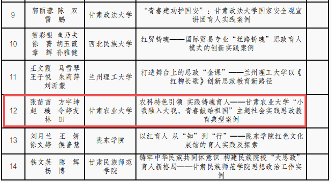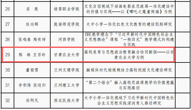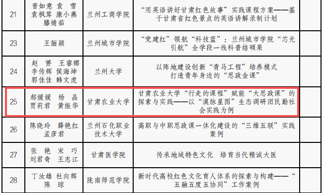 本次获奖成果涵盖三大类别,其中优秀论文2篇、优秀典型案例2篇、优秀“大思政课”公开课2项。《马克思“真正的”共同体思想视域下农业院校“大思政课”育人共同体的建构逻辑》和《高校美育与思想政治教育融合协同新探——以甘肃农业大学为例》荣获优秀论文奖;《农科特色引领 实践铸魂育人——甘肃农业大学“小我融入大我,青春献给祖国”主题社会实践思政教育典型案例》和《甘肃农业大学“行走的课程”赋能“大思政课”的探索与实践——以“漠脉星图”生态调研团民勤社会实践为例》荣获优秀典型案例奖;《在红星闪耀处,回答》和《赓续南梁薪火勇担时代使命》荣获优秀“大思政课”公开课奖。