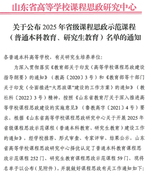 近日,山东省高等学校课程思政研究中心公布2025年省级课程思政示范课评选结果,我校推荐申报的《设计思维与表达》《企业运营模拟实训》两门课程全部成功获,申报获批率100%,为学校课程思政建设再添标志性成果。