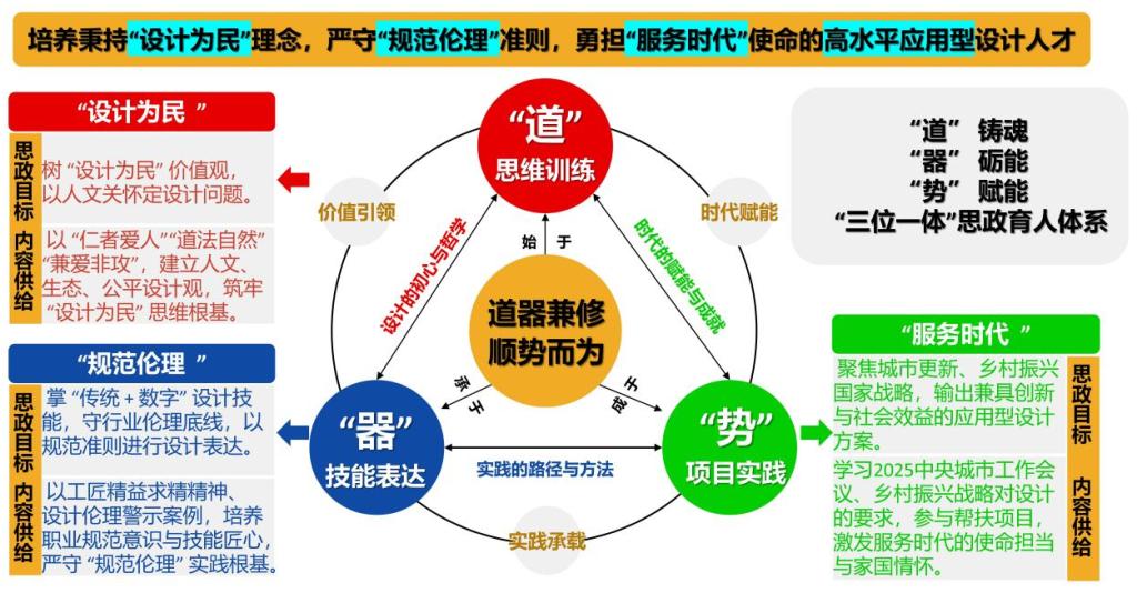 作为学校课程思政建设标杆课程,《设计思维与表达》以“道器兼修、时代赋能”为核心,构建“价值塑造、思维训练、技能表达”三位一体思政育人体系。课程深度融入“仁者爱人”“道法自然”等哲学理念,聚焦城市更新、乡村振兴等国家战略,引导学生树立“设计为民”的价值观,在传承黄河文化、践行生态伦理的过程中,锤炼专业技能与职业匠心。《企业运营模拟实训》则立足实践教学定位,从中华优秀传统文化中汲取智慧,通过“管鲍之交”等经典案例,提炼“以信相交”“以能相补”的团队协作理念,将职业素养、全局观念与家国情怀培育贯穿实训全过程,助力学生在模拟企业运营中提升综合能力,厚植责任担当。