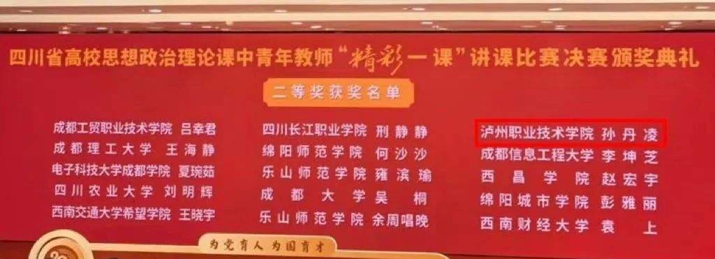 7月21日,四川省高校思想政治理论课中青年教师“精彩一课”讲课比赛决赛在西华师范大学落幕。我校教师表现优异,周珺老师荣获《毛泽东思想和中国特色社会主义理论体系概论》课程(高职高专组)特等奖,孙丹凌老师荣获《形势与政策》课程(高职高专组)二等奖。