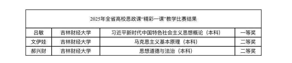 近日,吉林省教育厅公布了2025年全省高校思政课“精彩一课”教学成果展示获奖名单,马克思主义学院教师吕敏荣获一等奖,文伊娃、郝兴财荣获二等奖。
