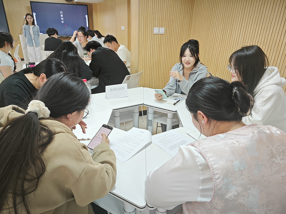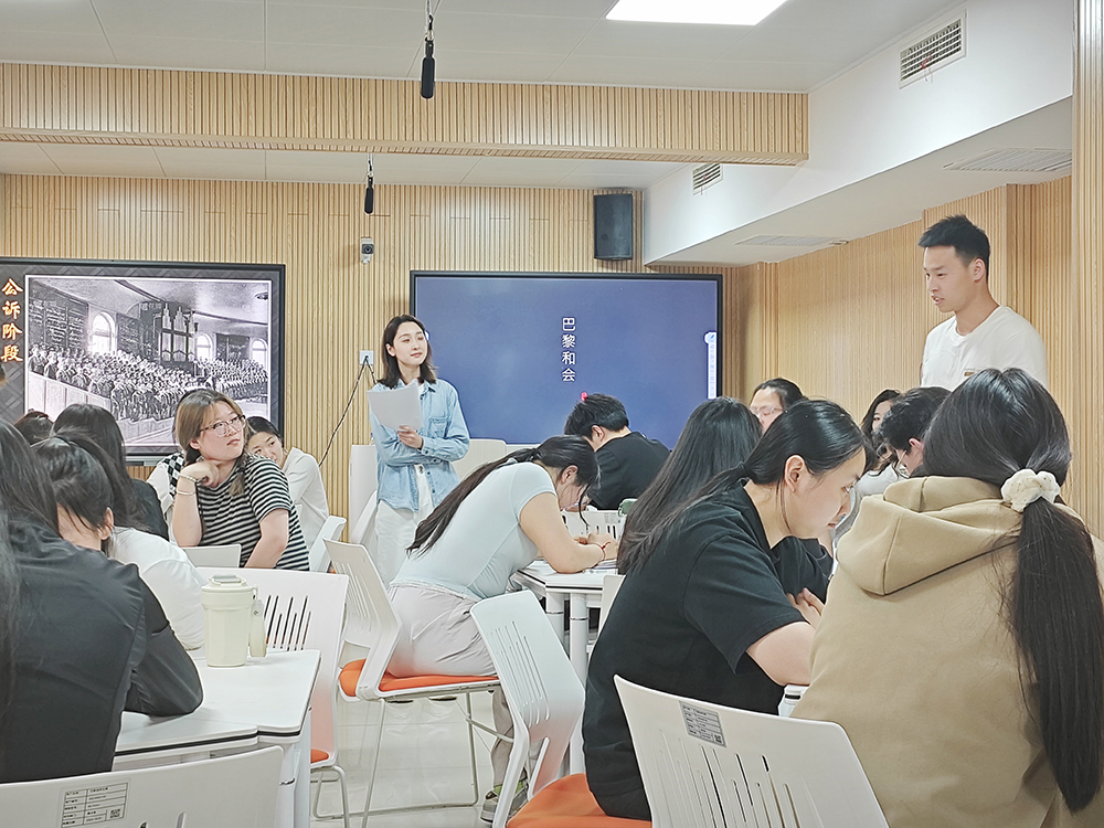 “剧本杀”的游戏流程通常包括角色分配、线索收集、推理分析和结局揭晓等阶段,游戏人数和时长可以根据实际需要进行调整,以适应不同的场合和需求。本次活动现场,学生们被分为六个小组,分别代表“一战”后的六大强国——英、法、美、意、日及中国,围绕战后世界秩序的重构展开激烈谈判。剧本精心设计,不仅还原了巴黎和会上的历史场景,还融入了大量历史文献与人物对话,让学生们仿佛穿越时空,亲历那段风云变幻的近代历史。通过这次模拟巴黎和会上的外交谈判,青年学子们不仅学习了历史知识,还锻炼了沟通协作能力和解决问题的能力,深刻体会到了国家利益与国际责任之间的平衡,增强了民族自豪感和使命感。