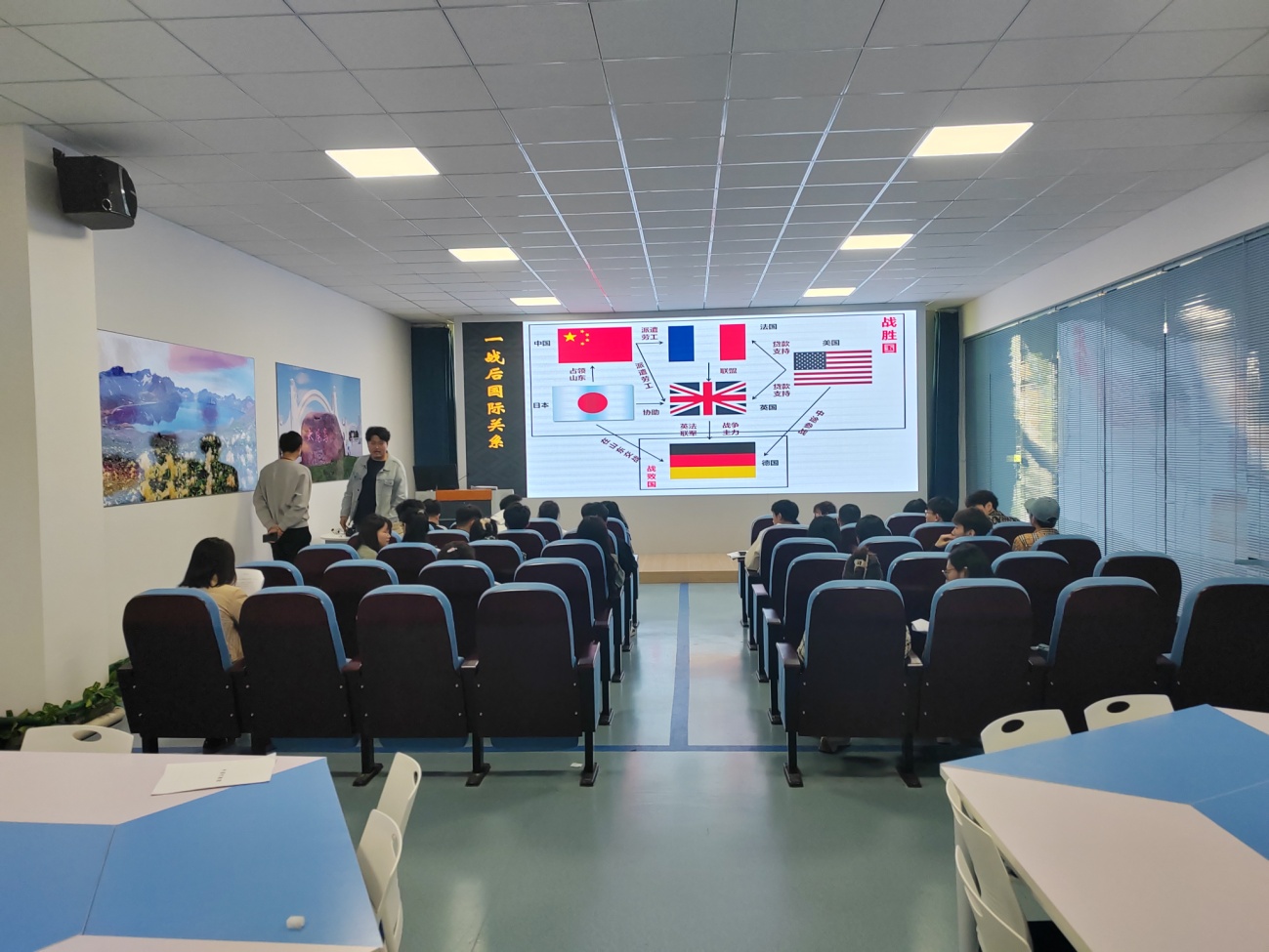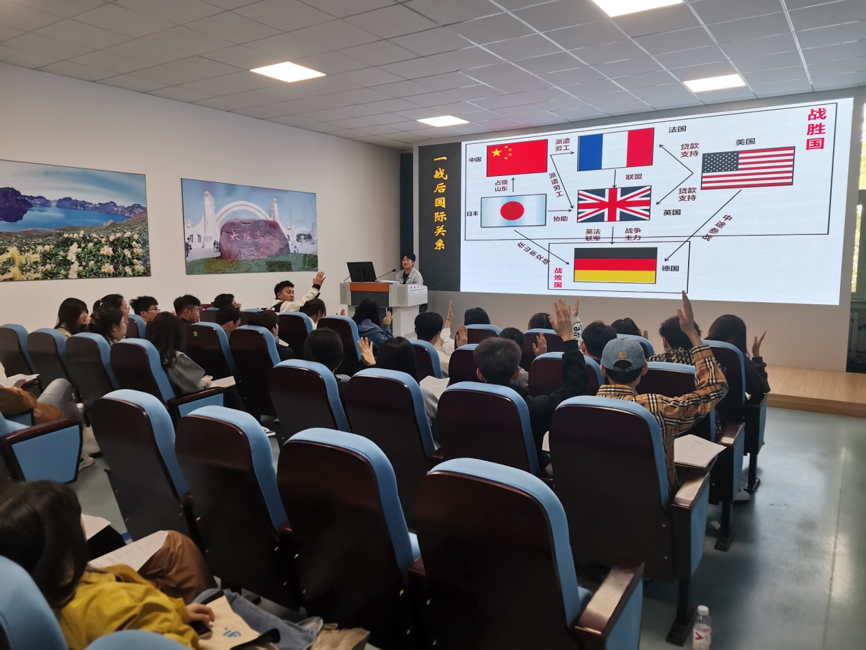 在讲师的引导下,学生们分组扮演英、美、法、日、德、中等6个国家的外交官,根据剧本的故事主线和任务线索,进行推理分析、抽丝剥茧,全情投入外交官身份。在“沉浸式”体验中,大家代表着各自国家,努力通过各种手段争取利益,现场发言讨论、争辩激烈。