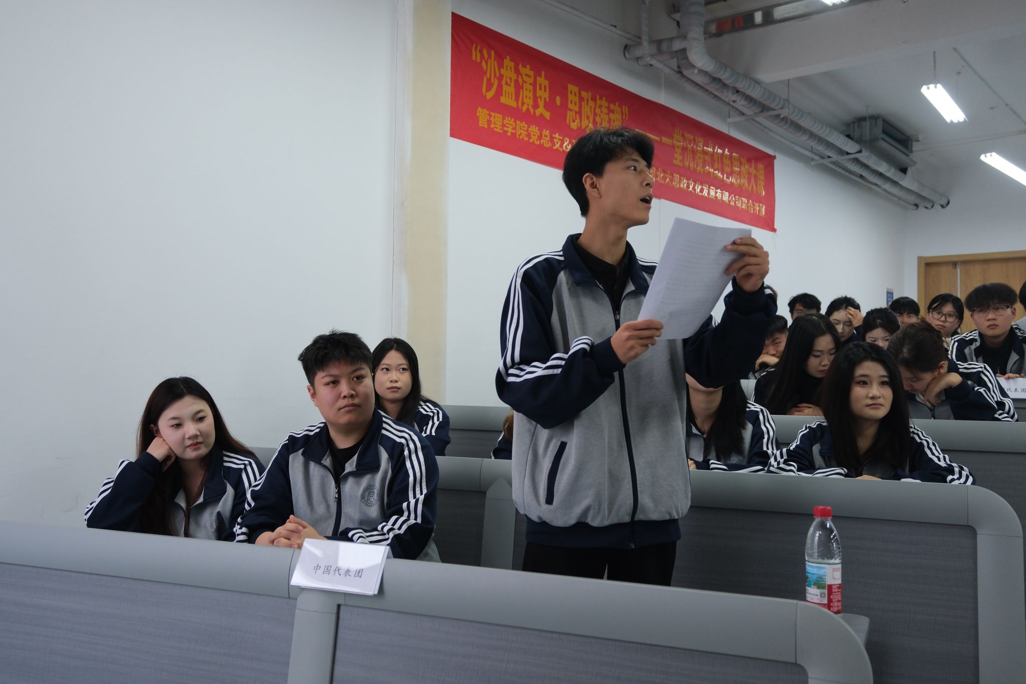 本次活动打破传统思政课堂的单向讲授模式,以巴黎和会为背景,创新打造“沉浸式的红色思政大课”,将红色资源与剧本沙盘深度融合,用沉浸式体验代替传统说教,用情景演绎串联历史与现实。剧本沙盘中共包含中、美、英、法、日、德6个代表团,每一个代表团由一名思政老师和9名学生组成,房金鼎主任担任活动主持人,带领各代表团开始紧张激烈的“抢夺战”。在“联结同盟国”环节中,各阵营代表依据历史背景与自身立场,展开唇枪舌剑的谈判与周旋,试图为己方争取更多话语权;在“宣读起诉书”环节里,扮演中国代表团的同学字字铿锵,细数列强侵略行径与德国侵占中国领土、掠夺资源的累累罪行;而“拍卖德国侵占中国领土与资源”的剧情,更是将活动推向高潮,同学们切身体会到了“弱国无外交”的屈辱与无奈,深刻理解了近代中国外交的艰难处境。