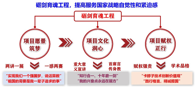 以重大项目为引导,构建“筑梦-润心-正行”育魂体系,打造强军兴国“砺剑育魂工程”,提高研究生服务国家战略的自觉性和紧迫感。