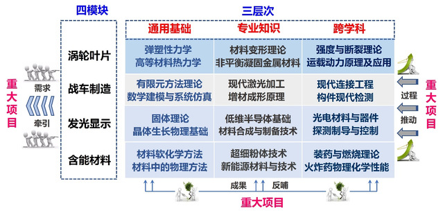 重大项目需求牵引课程重构,修订研究生培养方案,重构研究生课程体系;与光电、兵器、机械、控制等学科交叉融合,构建了围绕重大项目知识需求的学科基础课-专业进阶课-跨科交叉课“三层次”以及新型金属/智能增材/发光显示/含能材料“四模块”课程体系,学生跨学科、跨院系选课。