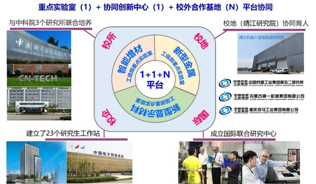 “1+1+N”平台协同。围绕重大项目攻关,组建新型金属/智能增材/发光显示/含能材料工信部重点实验室,与兵器工业集团内蒙一机、北方材料研究院等校企/校所/校地联合组建省部共建协同创新中心,“重点实验室-协同创新中心-项目合作单位”多机构协同育能。