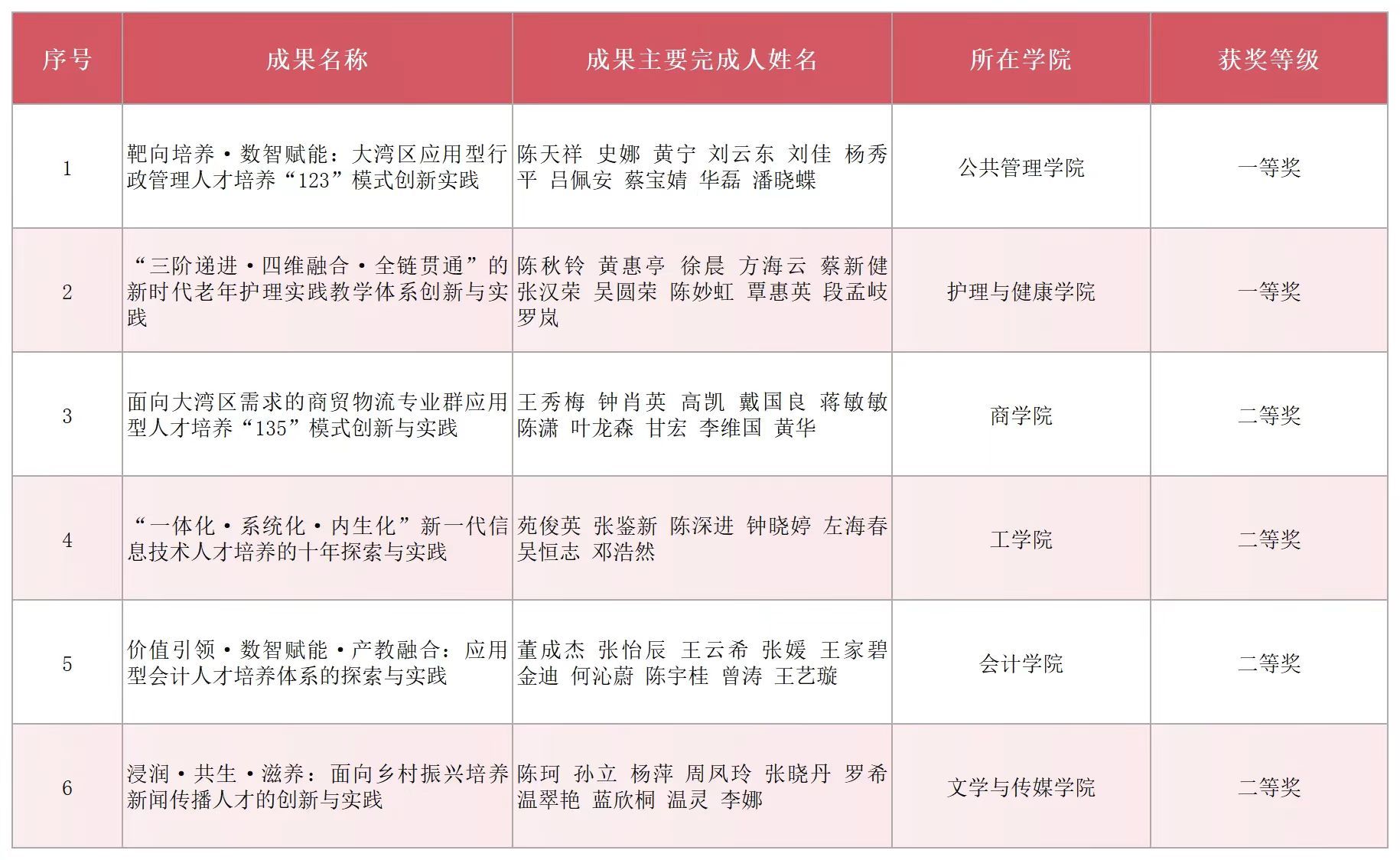 近日,广东省教育厅发布《2025年全省学校优秀教学成果奖(高等教育-本科类)拟获奖成果名单的公示》。我校共有6项教学成果入选,其中一等奖2项、二等奖4项,获奖总数在省内同类高校中并列第一,取得历史性突破。