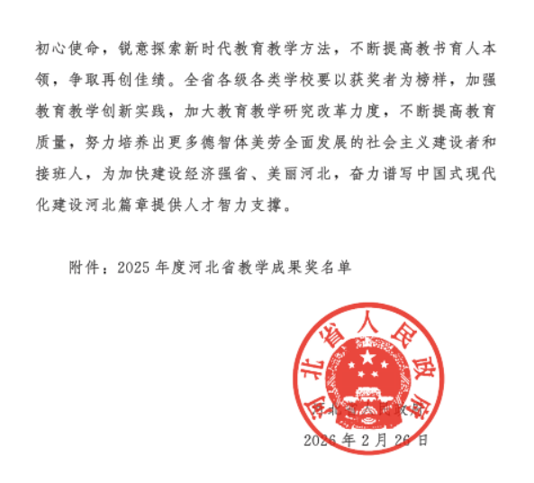 近日,河北省人民政府发布了《河北省人民政府关于2025年度河北省教学成果奖励的决定》,我校申报的党委书记云电军主持的教学成果《课程筑基—实践赋能—文化滋养—社会淬炼:地方师范院校四维育人体系的构建与实践》等三项教学成果全部获得殊荣,取得一等奖1项,二等奖2项。