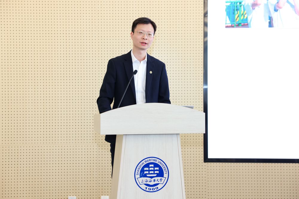 图9 商船学院党委书记秦立卿以“深化立德树人综合改革,打造新时代‘航海家的摇篮’”为题作交流发言