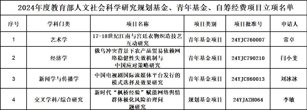 近日,教育部公布了2024年度教育部人文社会科学研究一般项目立项结果,我校立项规划基金项目1项、青年基金项目3项,立项数量位居省内同类高校前列。