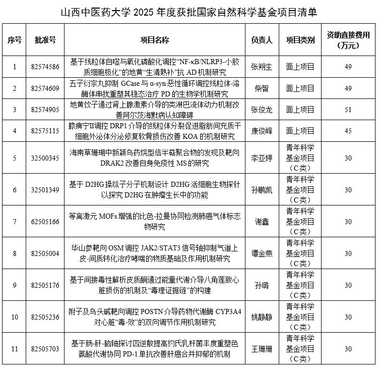 8月27日,国家自然科学基金委公布了2025年度国家自然科学基金项目的评审结果,我校共获批国家自然科学基金项目11项,其中面上项目4项、青年科学基金项目(C类)7项,直接经费共计404万元。这是我校近十年来国家自然科学基金立项数量首次突破两位数的好成绩。我校获批国家自然科学基金数量连续两年位居全省高校第8位。