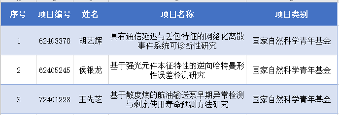 8月23日,国家自然科学基金委员会公布了2024年度国家自然科学基金项目的评审结果,我院共获批资助青年科学基金项目3项,分别是胡艺辉老师的“具有通信延迟与丢包特征的网络化离散事件系统可诊断性研究”、侯银龙老师的“基于强光元件本征特性的逆向哈特曼形性误差检测研究”和王先芝老师的“基于散度熵的航油输送泵早期异常检测与剩余使用寿命预测方法研究”。