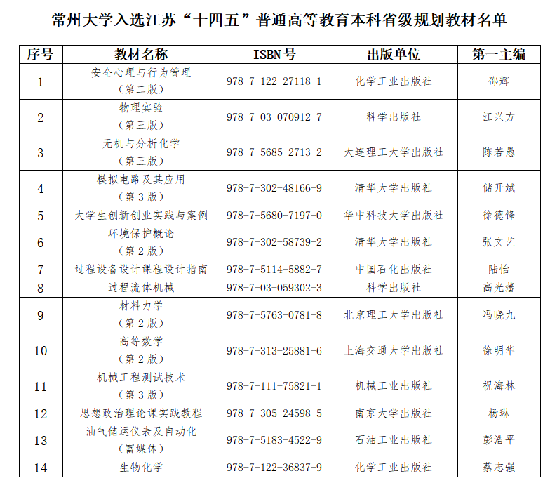 近日,江苏省教育厅公布了江苏“十四五”普通高等教育本科省级规划教材名单,我校《思想政治理论课实践教程》等14部教材入选省级规划教材,其中6部教材入选“十四五”普通高等教育本科国家级规划教材推荐名单。