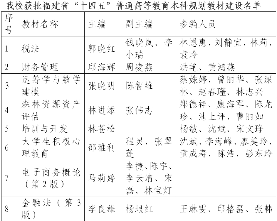 近日,福建省教育厅公布了福建省“十四五”普通高等教育本科规划教材建设立项名单,我校《税法》等13部教材获批立项。