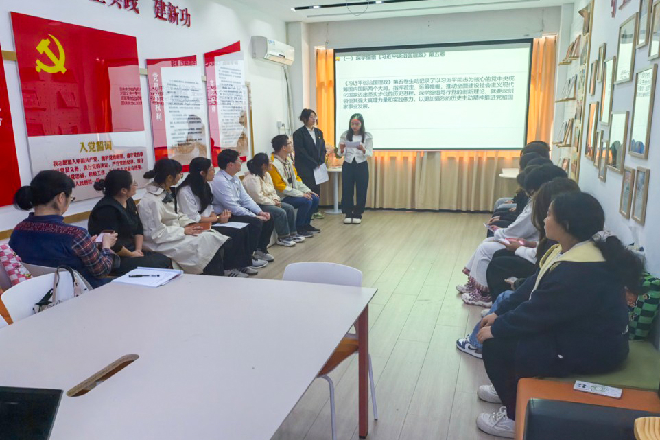 党员李庆芳领学了《习近平谈治国理政》(第五卷)的相关篇章。她从外语与文法的专业视角出发,倡导将理论学习与专业实践紧密结合,号召青年党员积极参与文体活动和社会实践,充分发挥先锋模范作用,展现新时代青年蓬勃向上的朝气和昂扬向上的精神风貌。
