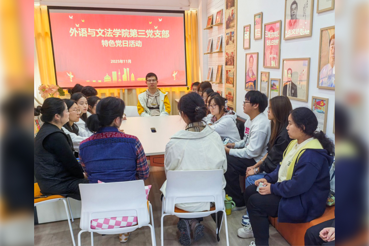 为引导青年党员坚定政治自觉,矢志不渝听党话、跟党走,在学思践悟中凝聚奋进力量,争做新时代有为青年。2025年11月5日,外语与文法学院第三党支部在党群服务中心举办“赓续红色血脉,激扬青春担当”特色党日活动。
