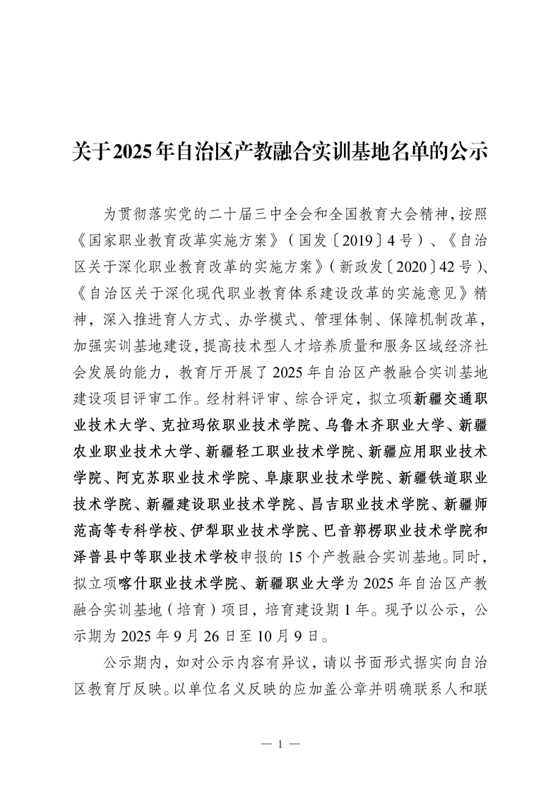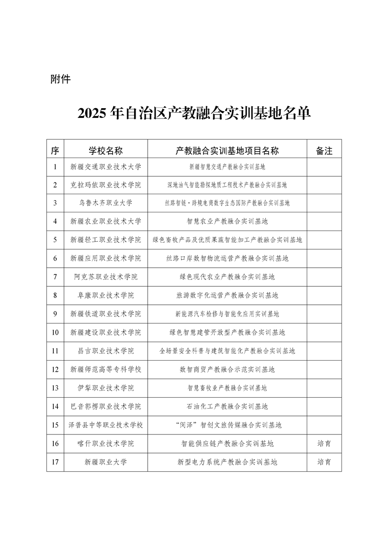 新疆维吾尔自治区教育厅关于2025年自治区产教融合实训基地名单的公示