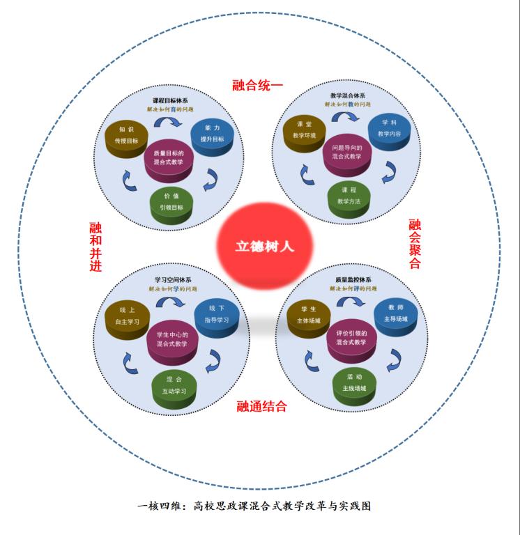 学校从2007年开始,围绕如何教、如何学、如何育、如何评四个环节,构建了高校思政课课程目标体系、学习空间体系、教学混合体系、质量监控体系四个体系,形成了以“立德树人”为核心,以学生为中心、以问题为导向、以质量为目标、以评价为引领的四个维度的“一核四维”的思政课混合式教学体系。