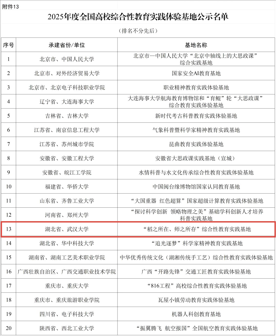 近日,教育部办公厅公布2025年度高校思想政治工作质量提升综合改革与精品建设项目名单,经组织推荐、资格审核、专家遴选、结果公示等程序,武汉大学杂交水稻全国重点实验室申报的“稻之所在、师之所存”综合性教育实践体验基地入选2025年度全国高校综合性教育实践体验基地。
