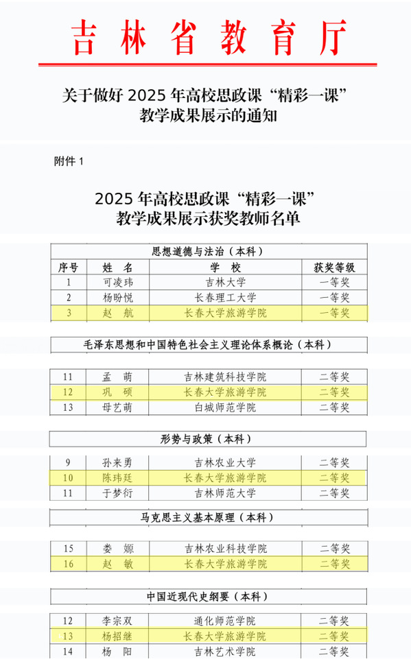 近日,吉林省教育厅公布了2025年全省高校思政课“精彩一课”教学成果展示评选结果。我校马克思主义学院多名教师在此次活动中脱颖而出,载誉而归。其中,赵航凭借扎实的理论功底与创新的教学设计,荣获《思想道德与法治》课程组一等奖;巩硕、陈玮廷、赵敏、杨招继分别荣获《毛泽东思想和中国特色社会主义理论体系概论》《形势与政策》《马克思主义基本原理》《中国近现代史纲要》课程组二等奖。这是我校近年来的又一次历史性突破,也是我校思政课教师队伍在全省高校同行中展现教学风采和育人能力的集中体现。